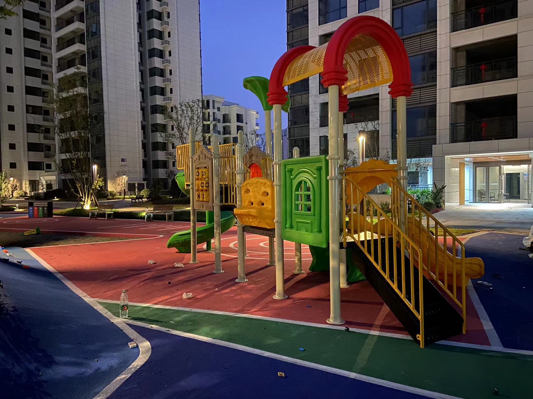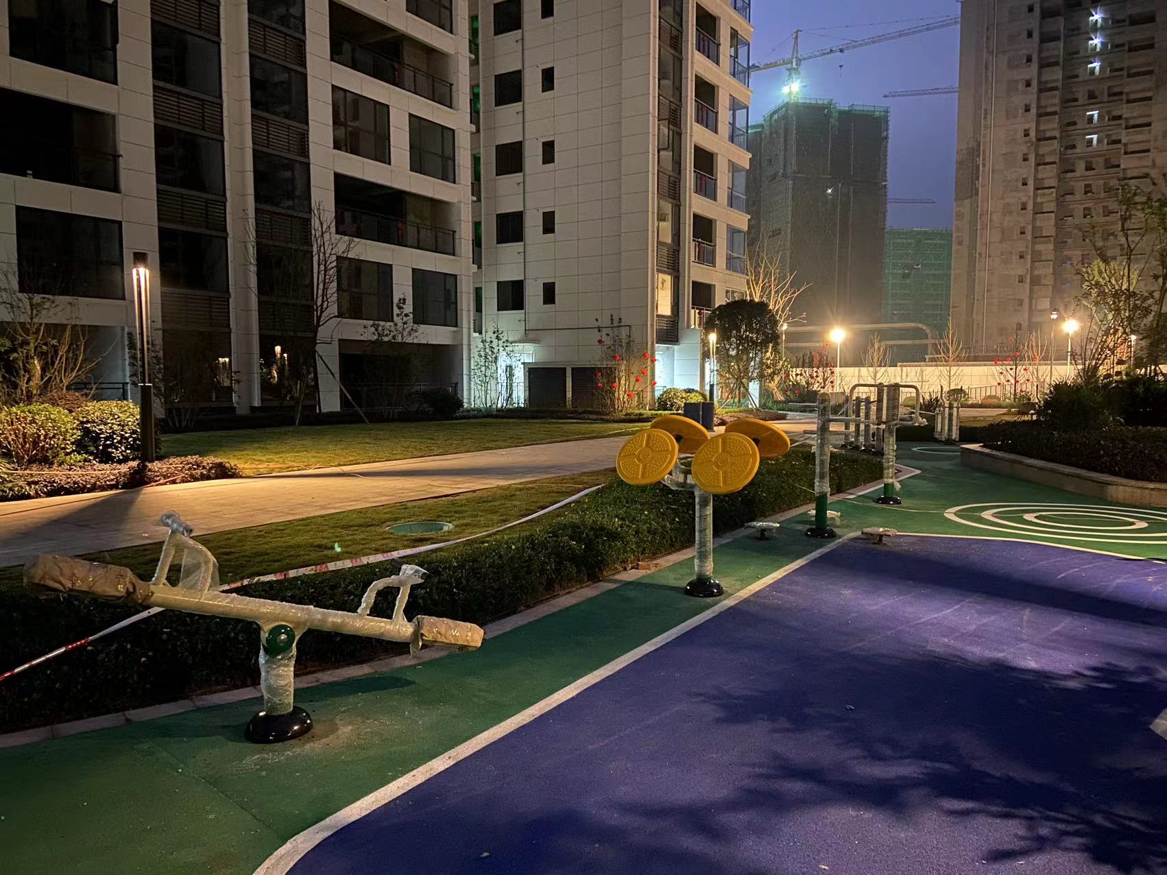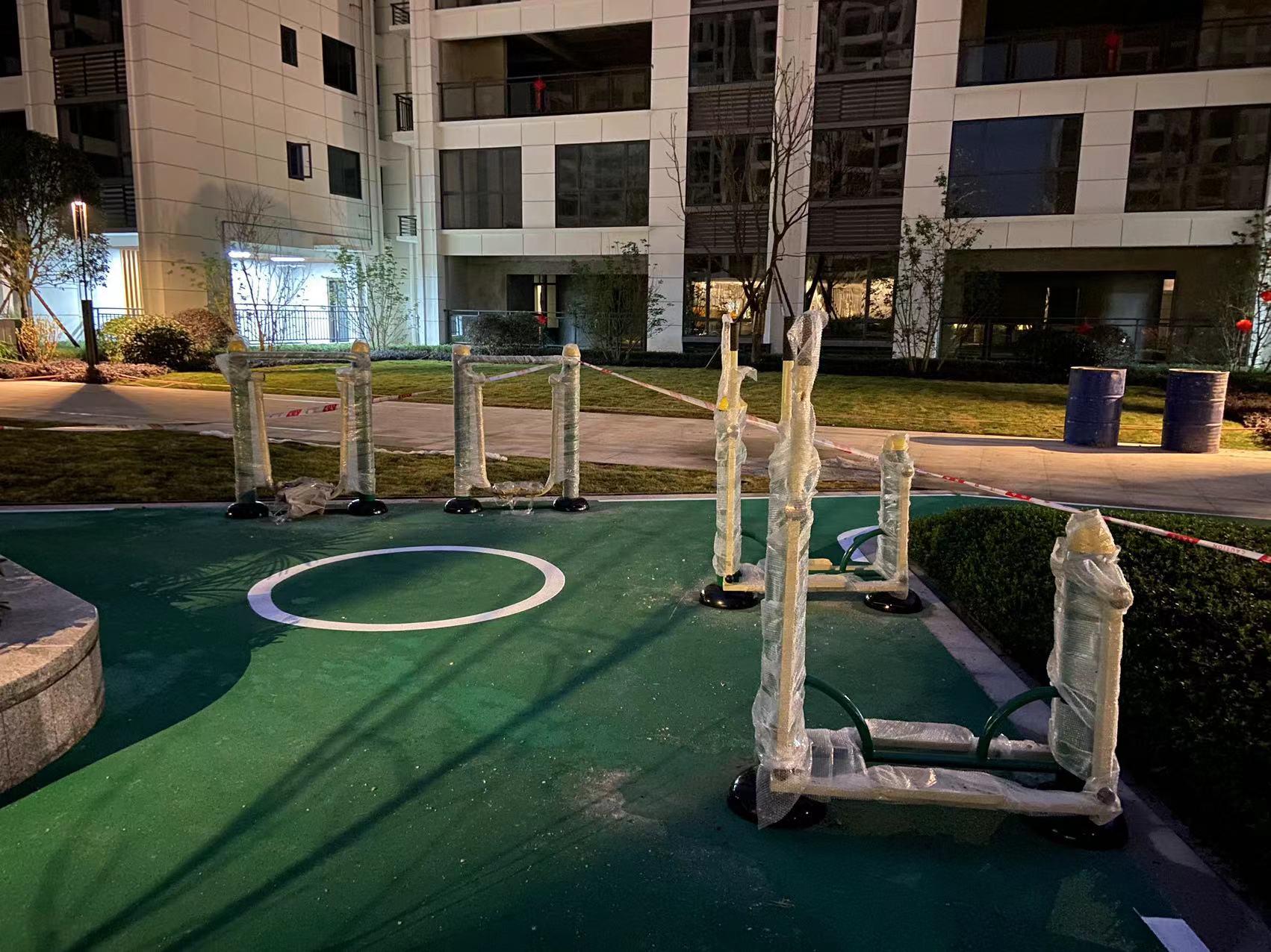 客户采购第一批次地产园林设施送货安装,包括儿童组合滑梯玩具,室外健身器材,公共长椅,定制桌椅,果皮箱等。